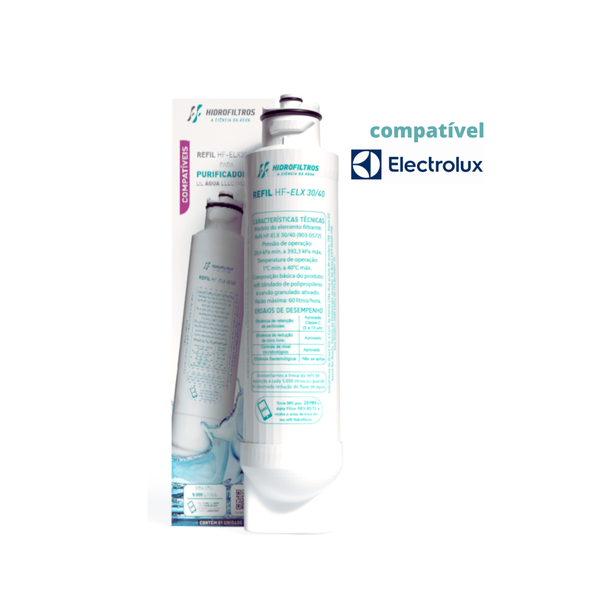 O refil HF-ELX30/40 é produzido pela Hidrofiltros, empresa brasileira sediada em SC, e é compatível com os refis dos purificadores e água Electrolux que correspondem ao código PAPPCA40, utilizado nos modelos: